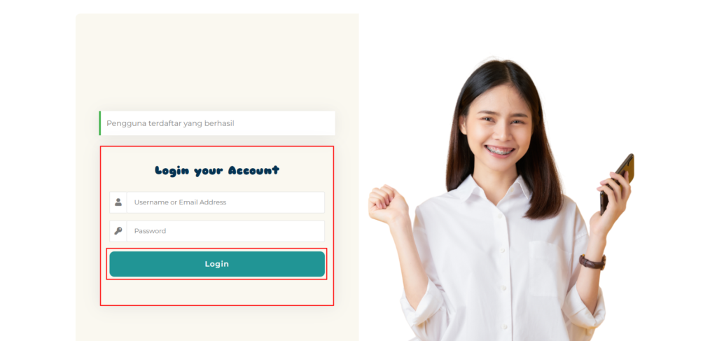 Setelah pendaftaran berhasil dilakukan, masukan username atau alamat email dan password lanjutkan dengan klik Login