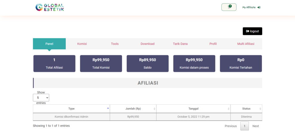 Panel ini merupakan informasi statistik afiliasi dan saldo komisi