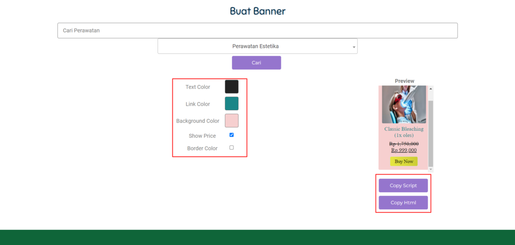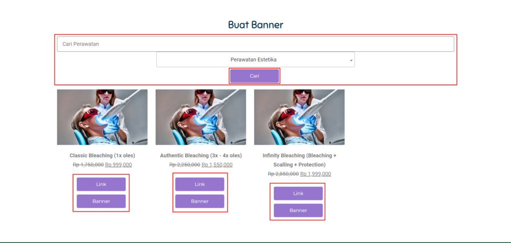 Klik Cari Perawatan untuk membuat banner berdasarkan perawatan dan klik Kategori Perawatan dan klik Cari