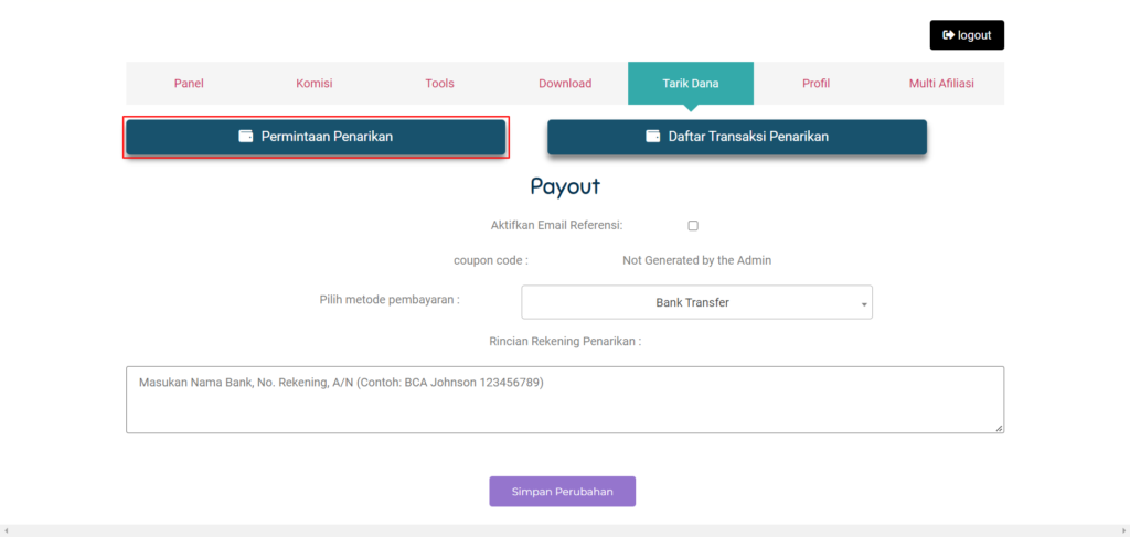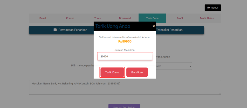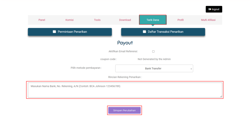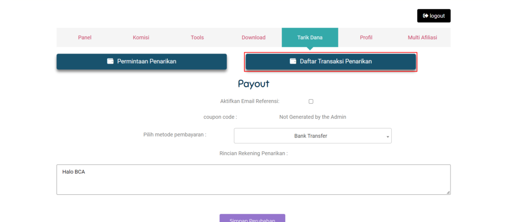 Pada halaman My Affiliate, klik Tarik Dana dan masukan Nama Bank, No. Rekening dan atasnama Pemilik Rekening dan klik Simpan Perubahan seperti pada Gambar diatas