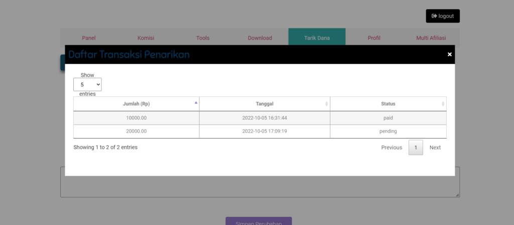 Klik pada Daftar Transaksi Penarik untuk mengecek status penarikan yang akan di konfirmasi oleh admin