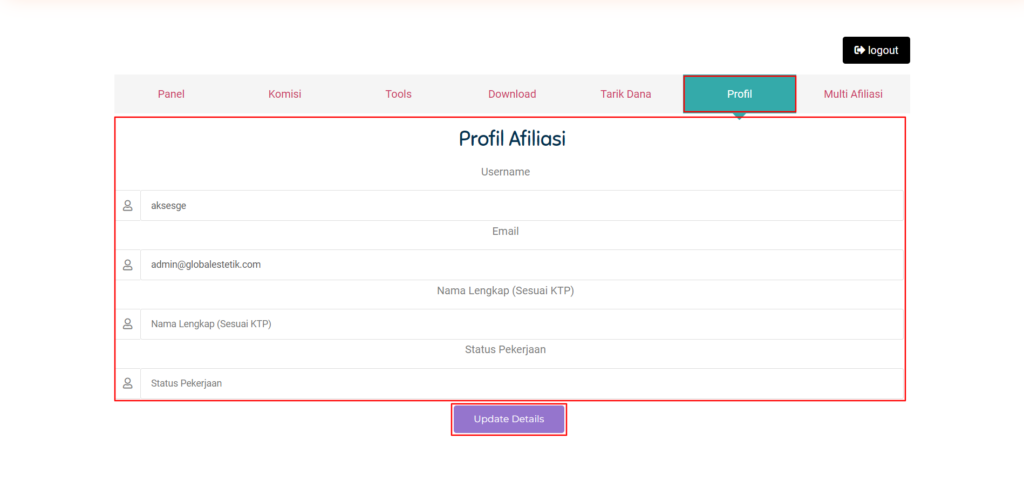 Pada halaman My Affiliate, klik Profil dan masukan username, email, nama lengkap (sesuai ktp) dan status pekerjaan dan klik Update Details seperti pada Gambar diatas